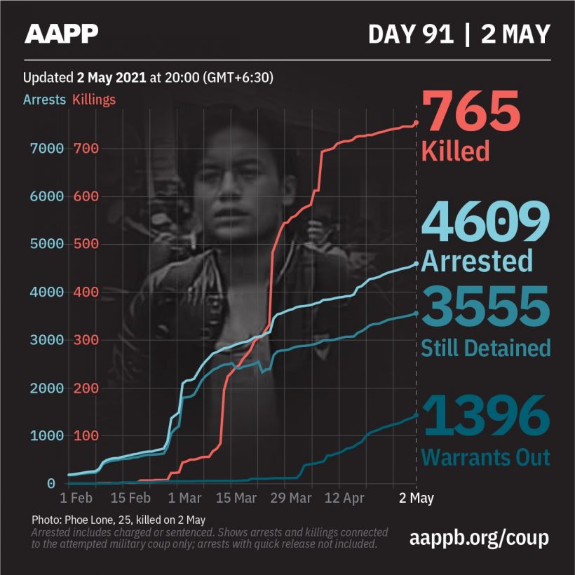 As of 2 May, (765) people are now confirmed killed by this junta coup. The Assistance Association for Political Prisoners (AAPP) compiled and documented (6) fallen heroes today. (2) from Hsipaw Town and Nawngcho Town in Shan State, (1) from Hpakant Town in Kachin State and (2) from Wetlet Town in Sagaing Region died on 2 May. (1) from Kutkai Town in Shan State was killed yesterday and documented today. This is the number verified by AAPP, the actual number of fatalities is likely much higher. We will continue adding as and when.